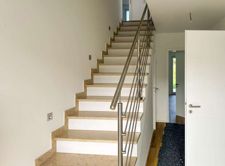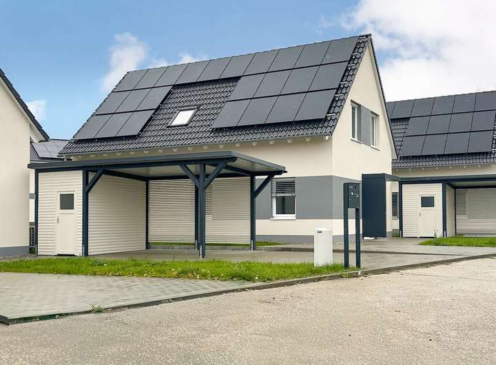 Das gesamte Haus wird über eine Luft-Wärmepumpe in Kombination mit einer Photovoltaikanlage und Batteriespeicher beheizt. Eine Fußbodenheizung sorgt in allen Räumen für angenehme Wärme. Zudem sind die Fenster mit Raffstores ausgestattet, die effektiven Sonnenschutz bieten.