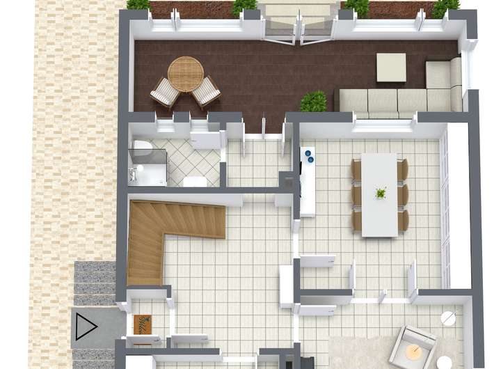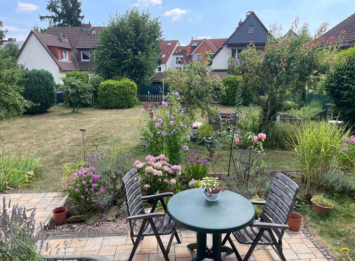 Im Erdgeschoss (Hochparterre) befinden sich neben dem Wohnzimmer mit angrenzendem Esszimmer die Küche, ein Tageslichtbad mit bodengleicher Dusche sowie der nachträglich angebaute Wintergarten, der sich über die gesamte Breite des Hauses erstreckt. Von hier aus erreichen Sie über wenige Stufen die Terrasse mit dem unmittelbar angrenzenden großen Garten.