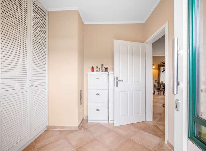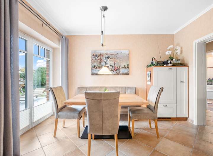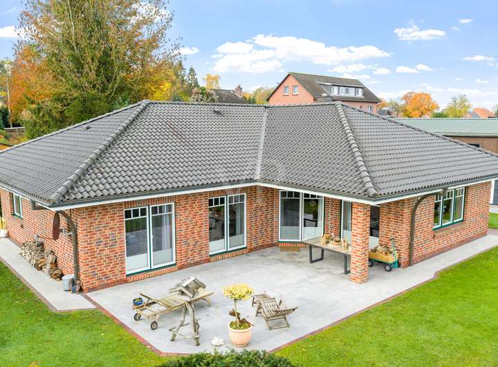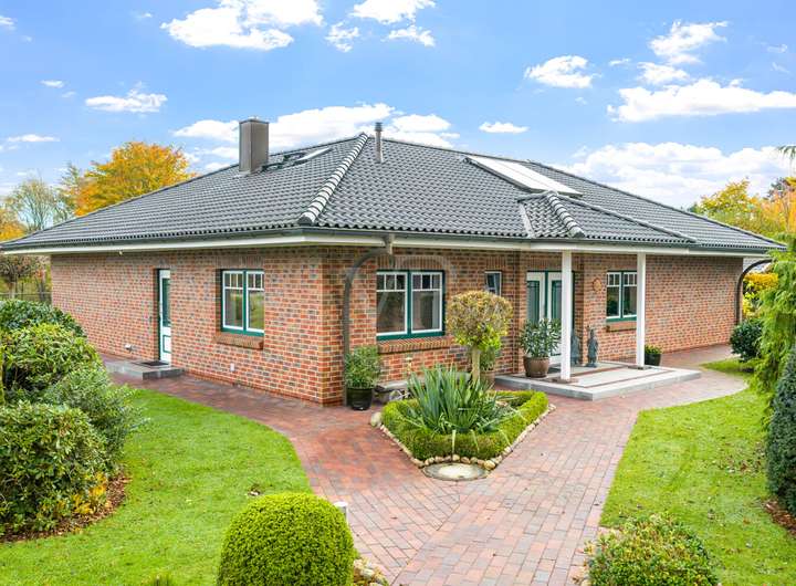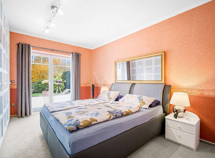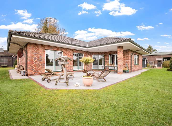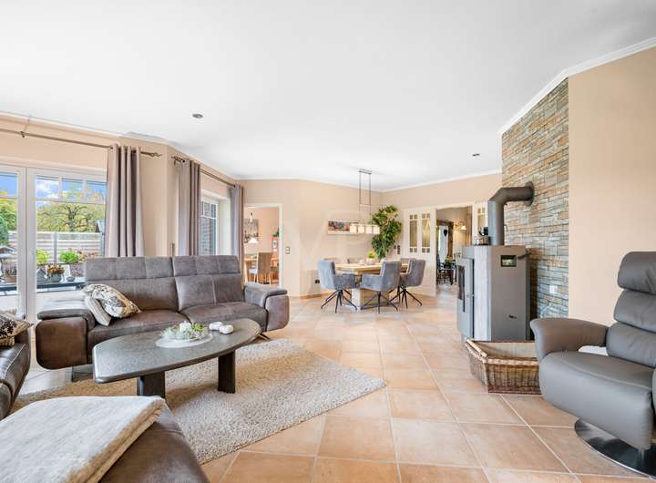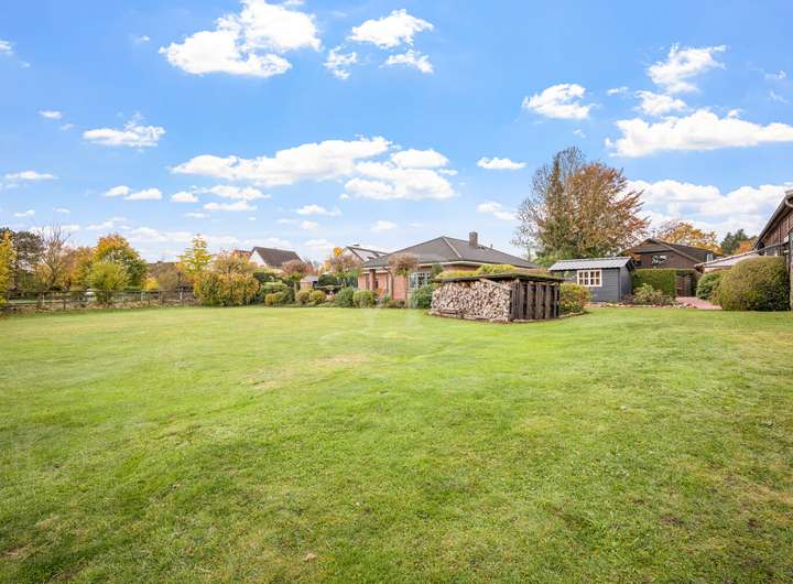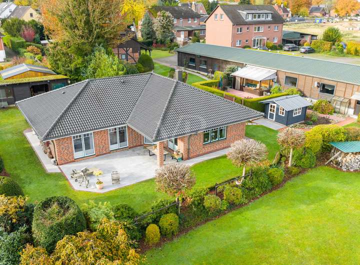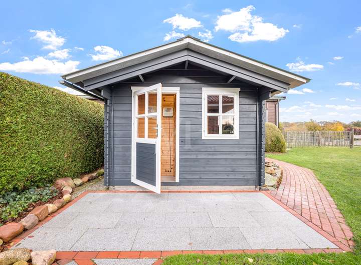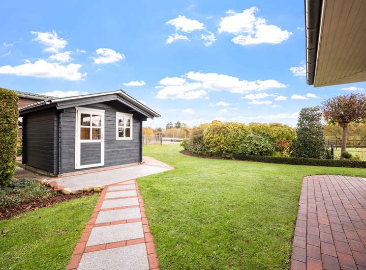 Die Immobilie wurde im Jahr 2023 zuletzt modernisiert, sodass technische Anlagen und Oberflächen einem zeitgemäßen Standard entsprechen. Alle Räume sind barrierefrei zugänglich, weshalb sich diese Immobilie auch als langfristiges Zuhause eignet. Das große Grundstück präsentiert sich als echtes Gartenparadies mit einer liebevoll gestalteten Bepflanzung, Rasenflächen und viel Freiraum für individuelle Freizeitaktivitäten. Die geräumige, mit Natursteinen belegte Terrasse lädt zu geselligen Stunden im Freien ein. Sie überzeugt durch ihre geschützte Lage und den schönen Ausblick in die Natur. Ein besonderes Extra ist das kleine blaue Gartenhaus, in dem sich eine perfekte Saunaoase versteckt. Hier profitieren Sie vom besonderen Wohngefühl, das durch die Kombination aus Großzügigkeit, Licht und Natur entsteht.