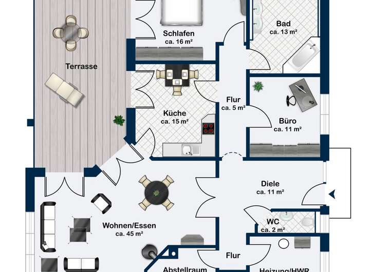 Die hochwertige, offene Einbauküche lässt keine Wünsche offen. Sie eignet sich ideal zum gemeinsamen Kochen und bietet direkten Zugang zur großzügigen Terrasse, die sich perfekt für Mahlzeiten im Freien oder entspannte Stunden eignet. Zwei komfortable Schlafzimmer bieten individuellen Rückzugsraum und ausreichend Platz für persönliche Gestaltungsideen. Ein modern ausgestattetes Bad mit klaren Linien und hochwertiger Einrichtung gewährleistet Privatsphäre und Funktionalität. Ein praktischer Abstellraum mit Außentür bietet genügend Platz für Ihre Garten- oder Regensachen. Die Ausstattung des Hauses erfüllt gehobene Ansprüche. Die gesamte Wohnfläche ist mit einer energiesparenden Fußbodenheizung ausgestattet und ein Glasfaseranschluss sorgt für eine schnelle Internetverbindung.