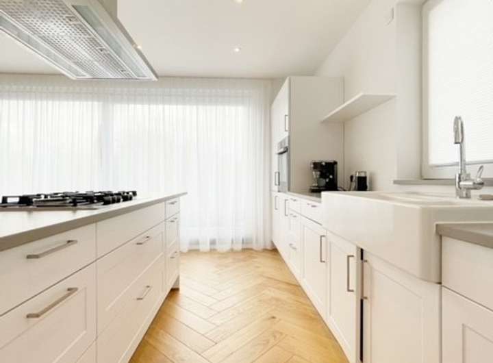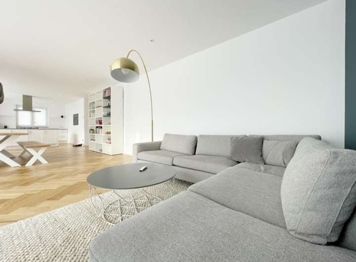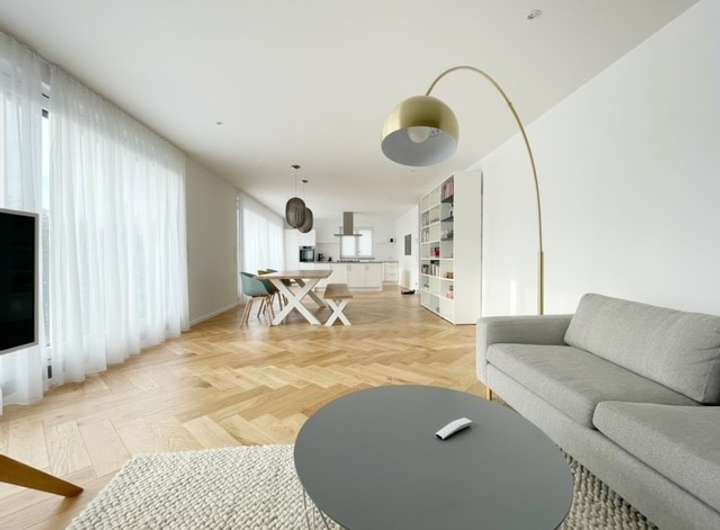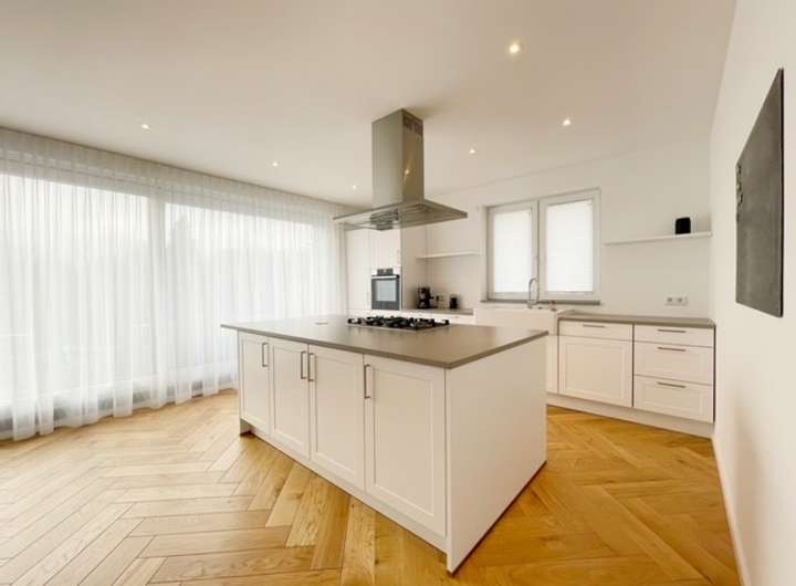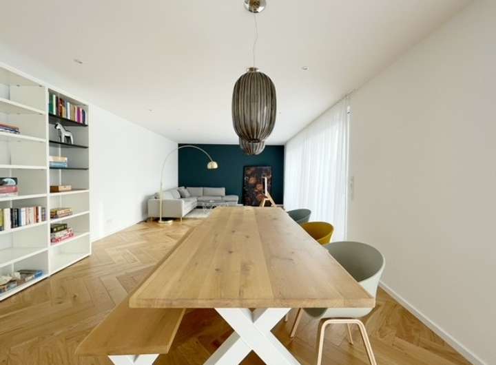 Ein sonniger Entrée empfängt und eröffnet großzügig und offen die Wohnräume. Mit über 55 m² verschmelzen der Wohn/- Ess/- und Kochbereich ineinander und gewähren einen tollen Ausblick ins Grüne. Großzügige Fensterfronten fluten jeden Winkel des Penthouses mit Licht und Sonne und bieten direkten Zugang zur sensationellen XXL- Dachterrasse (s/w- Lage). Der offene Küchenbereich verfügt über eine hochwertige Einbauküche (weiß/matt) mit einer Kücheninsel und ein praktischer Hauswirtschaftsraum gliedert sich an.