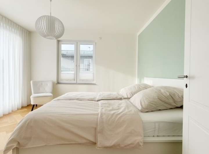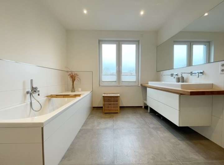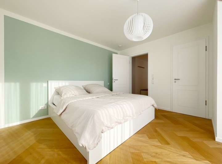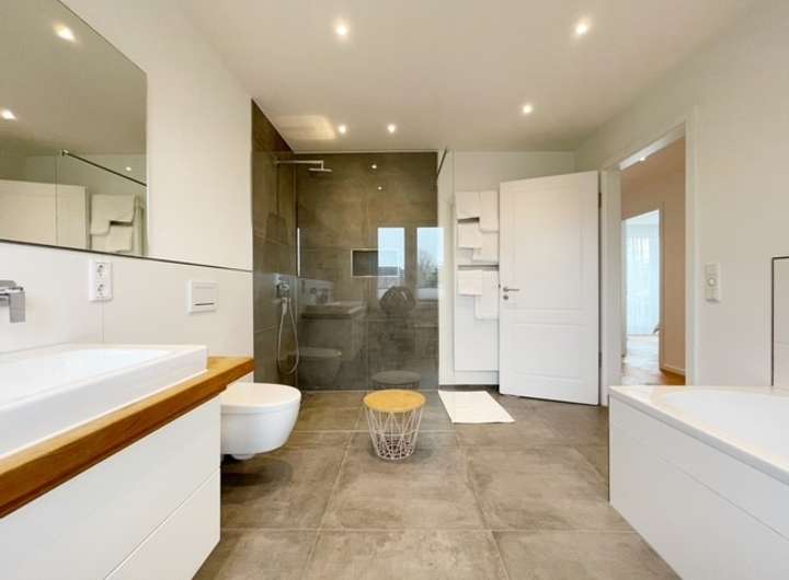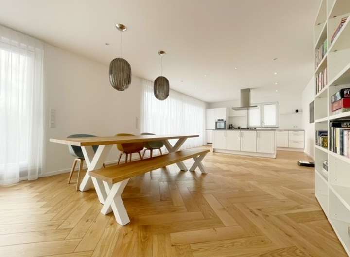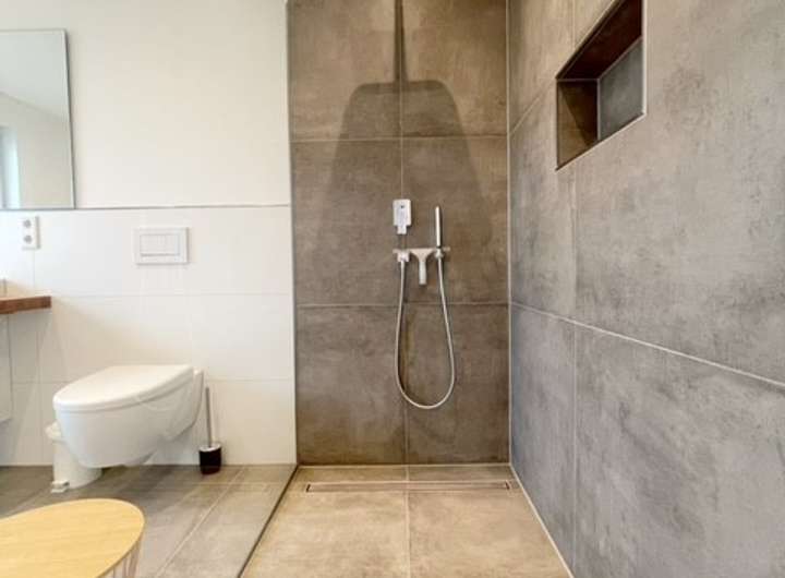 Parkettböden in warmen Holztönen und in Szene gesetzte Bäderwelten wirken durch die Kontrastfarben in anthrazit mit weißer Keramik und modernen Armaturen designorientiert und zeitlos. Die Wände sind mit einem Malervlies versehen und weiß gestrichen. Elektrische Raff- Stores sind an allen Fenstern verfügbar und beheizt wird ausstattungsgemäß über eine Fußbodenheizung mit Umweltwärme.
