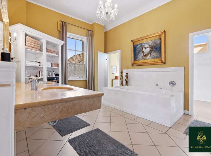 Ein offener, lichtdurchfluteter Wohnbereich mit bis zu fünf Meter Deckenhöhe, Bibliothek, Bar, Kamin und Panoramablick über den Garten – ein idealer Ort für Familienfeiern oder repräsentative Zusammenkünfte. Angrenzend an diesen außergewöhnlichen Wohnbereich befindet sich der großzügige Master-Bedroom mit begehbarer Ankleide und Bad-en-Suite. Ebenfalls am Wohnbereich liegt ein Flur mit fünf weiteren, nahezu gleich großen Zimmern, sowie zwei Badezimmern und einem Gäste-WC.