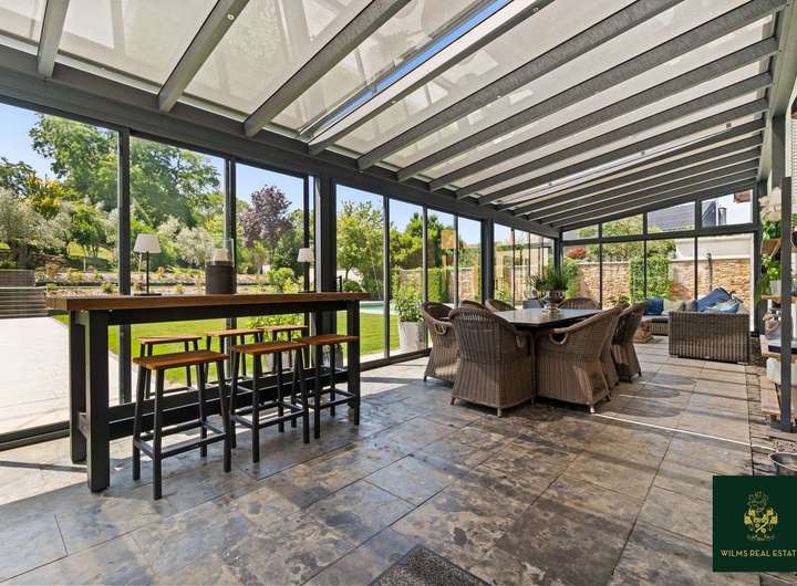 Darüber hinaus bietet das Entrée ein Gäste-WC und Zugang zu einem beeindruckenden Wintergarten mit herrlichem Weitblick über den parkähnlichen Garten. Alte Olivenbäume, ein beheizter Außenpool und viel Privatsphäre schaffen hier eine Oase der Ruhe und Erholung.