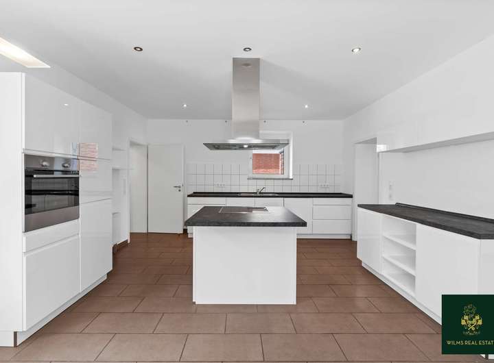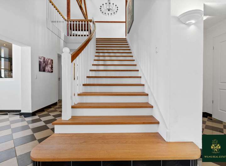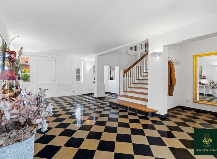 Beim Betreten des Hauses empfängt Sie ein repräsentatives Entrée mit doppelflügeliger Eingangstür und stilvollem Schachbrettboden – gefertigt aus originalen Fliesen einer belgischen Kirche. Dieser Bereich bildet den perfekten Auftakt für das, was Sie im Inneren erwartet.