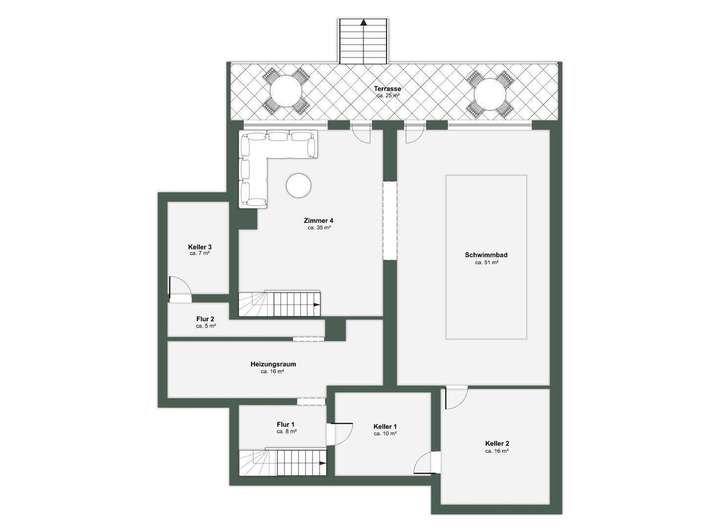 Ein echtes Alleinstellungsmerkmal des Hauses ist der Indoor-Pool im Untergeschoss. Dieser ist direkt mit einem kleinen Wellnessbereich samt Sauna verbunden und lädt das ganze Jahr über zu entspannenden Stunden ein – unabhängig von Wind und Wetter. Die großzügige Fensterfront im Poolbereich sorgt dabei für eine helle und angenehme Atmosphäre. Weitere Nutzflächen im Untergeschoss bieten ausreichend Platz für Lagerung, Technik oder kreative Hobbynutzung.