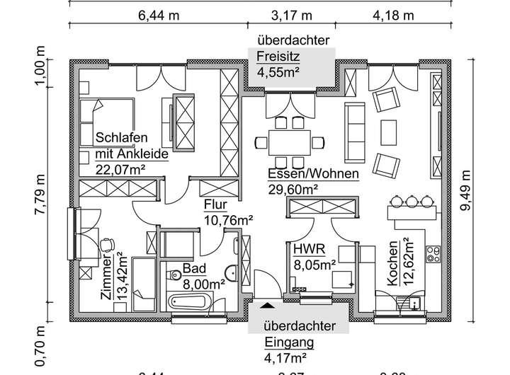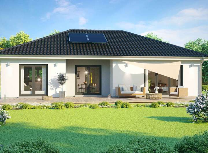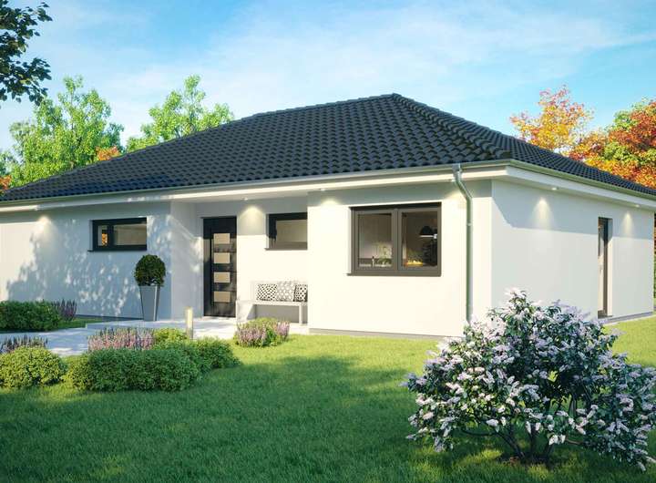 Dieser in allen Belangen großzügig ausgelegter Bungalow mit einem überdachtem und windgeschütztem Freisitz könnte Ihr Eigenheim werden. Küche, Essen und Wohnbereich modern und offen gestaltet. Ein überdachter Hauseingang lässt Sie nicht im Regen stehen. Ihr Schlafzimmer mit einer großen Ankleide ist Richtung Garten geplant, so dass Sie sich schon morgens auf eine schöne Aussicht freuen dürfen. Ein weiteres Zimmer als Büro, Kinderzimmer oder für Ihre Gäste zeigt in Richtung Straße. Das Badezimmer ist voll ausgestattet mit Wanne und natürlich bodengleicher Dusche.