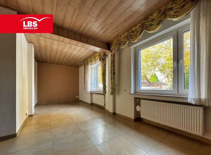 Vom Flur aus gelangen Sie links in den großzügigen Wohnbereich von ca. 25 m². Aus diesem Raum lassen sich wieder zwei Räume bilden, wie es früher war. Rechts vom Flur befinden sich das modernisierte Bad mit ebenerdiger Dusche. Ein weiterer Raum umfasst das Schlafzimmer sowie die Küche mit Essbereich und Zugang zum Wintergarten.