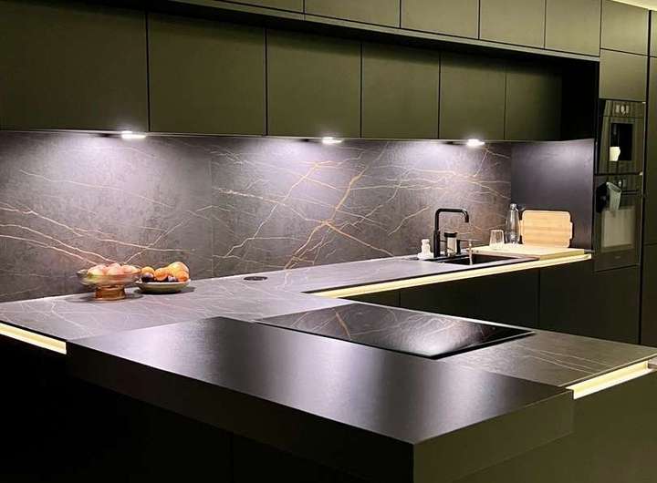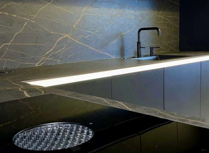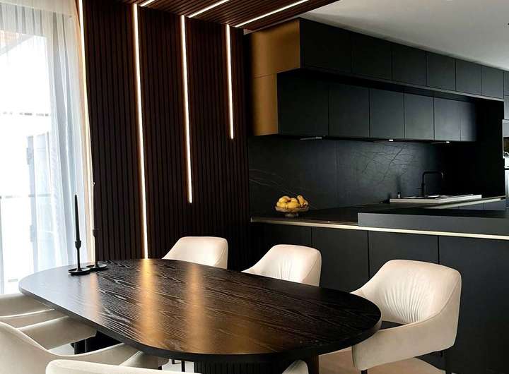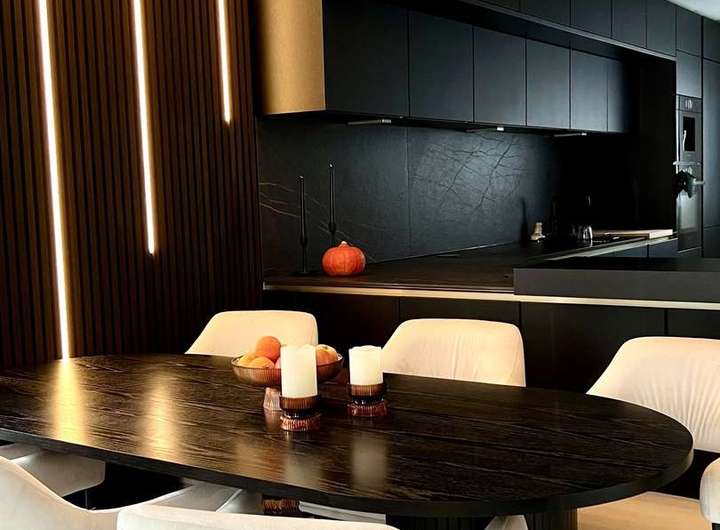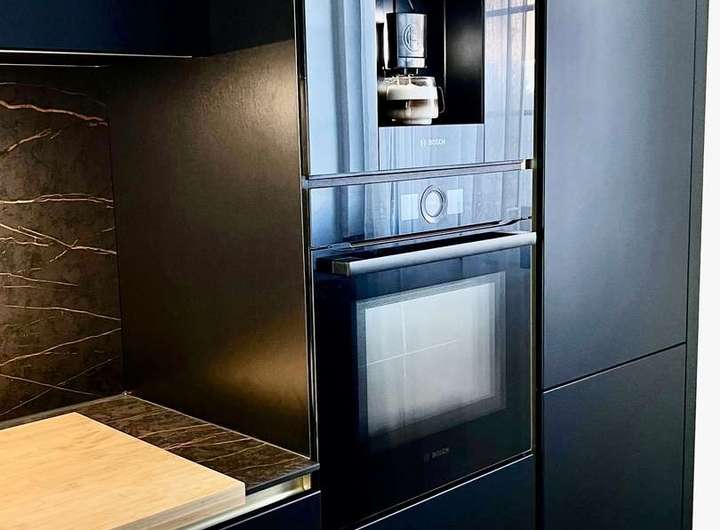 Die maßgefertigte und beleuchtete Einbau-Küche, mit modernsten Küchengeräten lädt zum kochen und verweilen ein. Die integrierte Kaffeemaschine, sowie die neuesten energieeffizienten Küchengeräte, Kühl- Gefrierkombination von Liebherr mit Wasserspender inliegend, Backofen Siemens, Bora Cerankochfeld, Quooker-Wasserspender, lassen keine Wünsche offen.