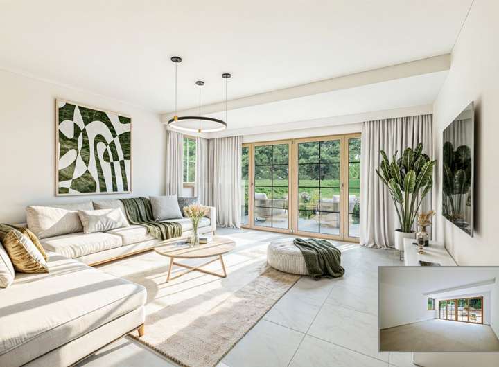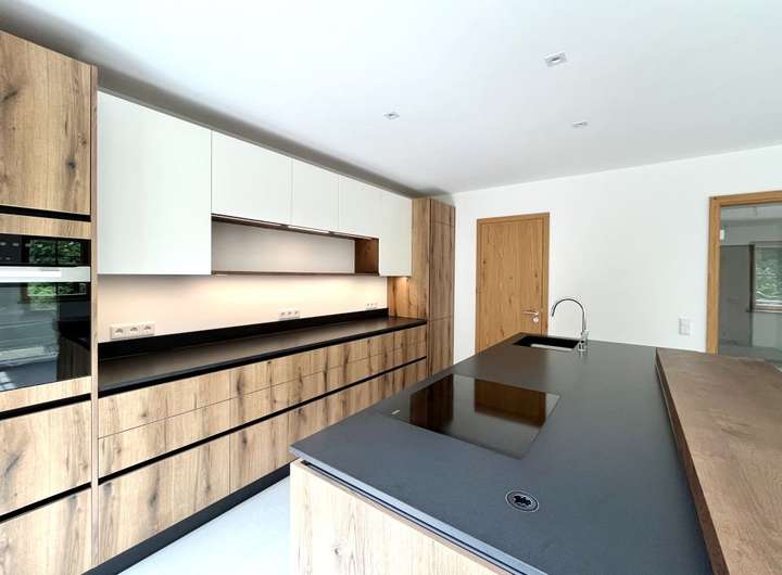 Das Herzstück des Hauses bildet das Erdgeschoss: Ein lichtdurchfluteter Wohn- und Essbereich mit offener Küche schafft Raum für geselliges Beisammensein. Der elegant wirkende, freischwebende Balkon eröffnet einen herrlichen Blick in den liebevoll gestalteten Garten – perfekt für entspannte Stunden im Freien.
