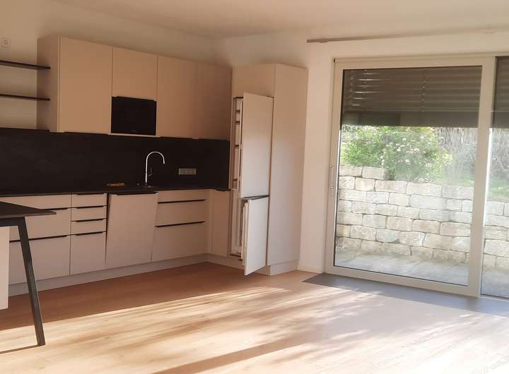 EG: Großer Wohn-Essbereich mit Einbauküche und Ausgang zur überdachten Gartenterrasse. Bad mit WC und Dusche, Wirtschaftsraum und Abstellraum.