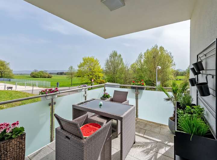 - Sonnige zwei Südbalkonen in Schlaf- und Wohnzimmern mit herrlichem Fernblick je Wohneinheit