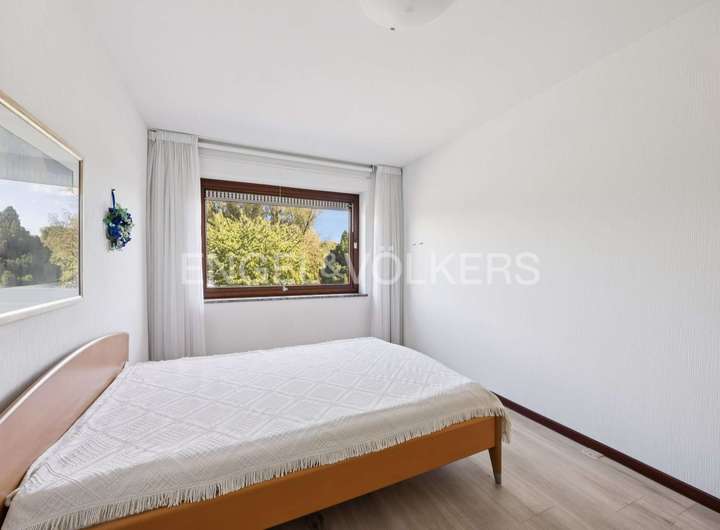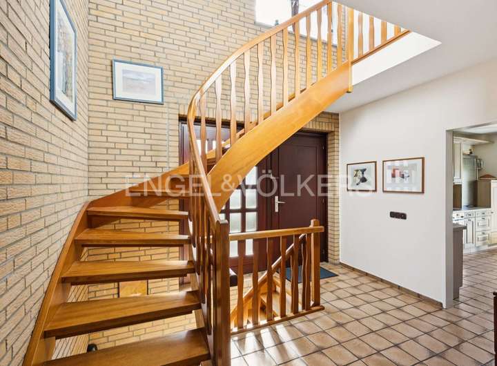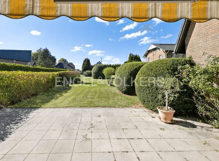 Zentraler Mittelpunkt ist der ca. 30 m² große Wohn-Essbereich. Er ist lichtdurchflutet durch eine über die gesamte Breite des Raumes gehende Fensterfront mit großer Terrassenschiebetür. Davor liegt die ca. 30 m² große, nicht einsehbare Terrasse mit perfekter Südwest Ausrichtung, auf der Sie in aller Ruhe die Sonnenstunden genießen oder unter der Markise im Schatten sitzen können. Daran schließt sich der weitläufige, gepflegte Garten an.