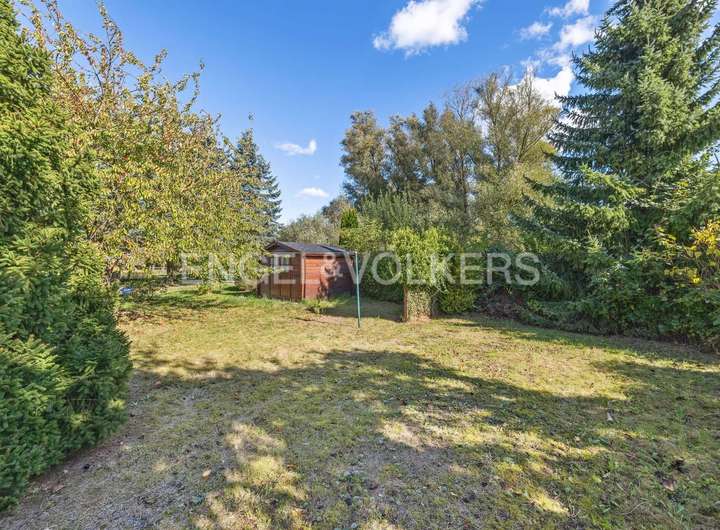 Hieran schließt sich der idyllische, hintere Gartenbereich mit Obstbäumen und einem großen Holzschuppen an.