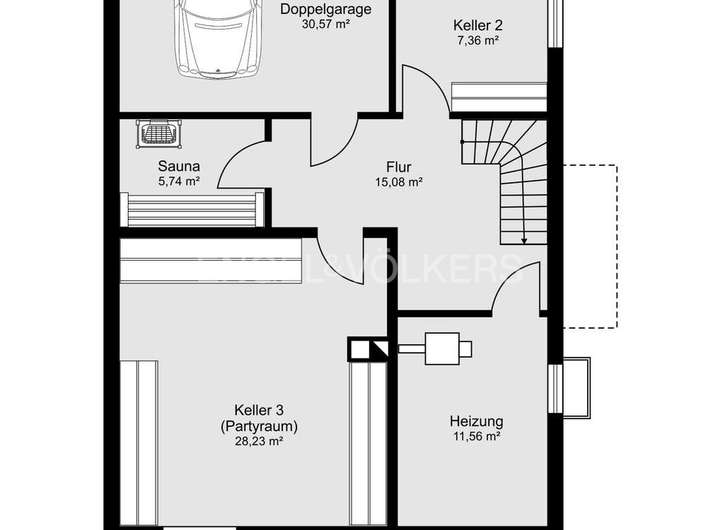 Das Haus ist vollständig unterkellert. Hier finden Sie einen ca. 30 m² großen Partyraum, einen Hauswirtschaftsraum, eine Sauna und ausreichend Abstellfläche.