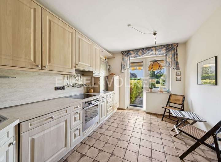 Direkt neben dem Wohn-Essbereich liegt die Küche, die ebenfalls über eine Tür zur Terrasse hin geöffnet werden kann. Wenn Sie einen modernen Grundriss mit offener Küche gestalten wollen, besteht hier eine gute Möglichkeit dazu. Zusätzlich bietet das Erdgeschoss ein schönes, großes zum hinteren Garten ausgerichtetes Schlafzimmer mit ca. 14 m², sowie ein kleineres Zimmer, das sich hervorragend als Gäste-, Arbeits- oder Kinderzimmer eignet.