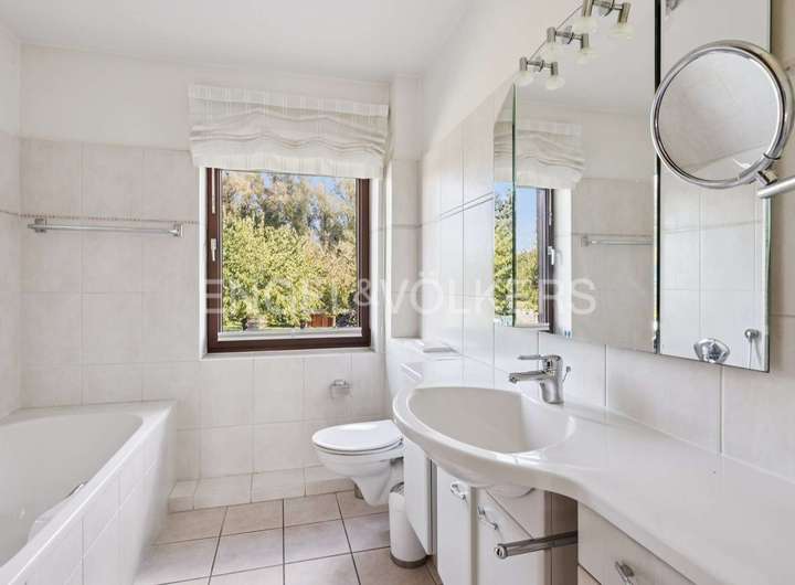 Ein helles, modernisiertes Badezimmer mit Wanne und Dusche sowie großem Fenster zum Garten hin vervollständigt diese Ebene.