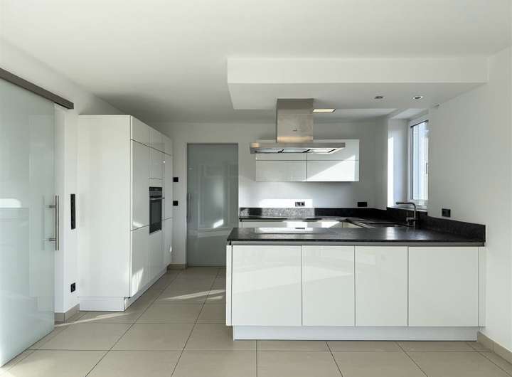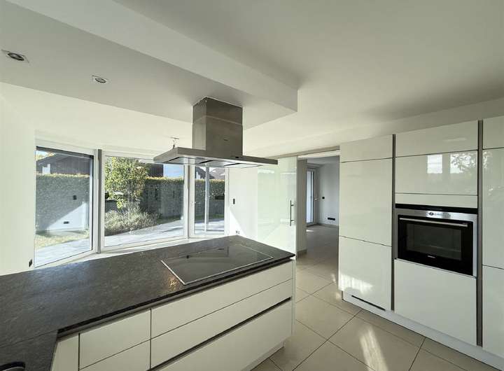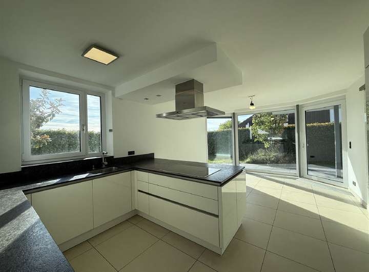 Über eine Stufe gelangen Sie in das weitläufige Wohnzimmer, das durch seine bodentiefen Glaselemente und eine große Schiebetür einen herrlichen Ausblick in den eigenen Garten mit Kinderschaukel eröffnet. Die Diele bietet zudem Zugang zur Terrasse und führt weiter in das Esszimmer sowie in die moderne Küche, die durch eine Milchglas-Schiebetür abgetrennt ist. Die Küche in U-Form ist mit hochwertigen Siemens-Geräten ausgestattet und verfügt über eine Granit-Arbeitsplatte sowie einen separaten Block mit Backofen, Kühlschrank und Gefriertruhe. Von hier aus gelangen Sie in die praktische Waschküche mit Einbauschrank und Spüle, die direkten Zugang zum Windfang und zur Doppelgarage bietet.