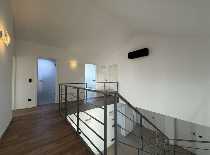 Eine elegante Holztreppe führt ins Dachgeschoss, wo sich fünf weitere Zimmer befinden jedes mit Klimaanlage ausgestattet. Zwei Zimmer davon verfügen über maßgefertigte Einbauschränke, eines ist mit Küchenanschlüssen vorbereitet und kann flexibel genutzt werden. Ein Gäste-WC mit Dachfenster sowie ein großzügiges Badezimmer mit Doppelwaschbecken, Bidet, WC und begehbarer Dusche in der Dachgaube runden das Raumangebot ab.