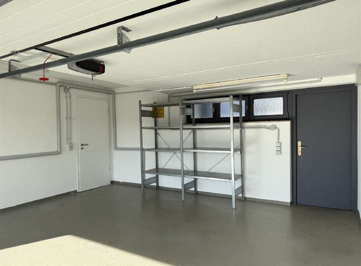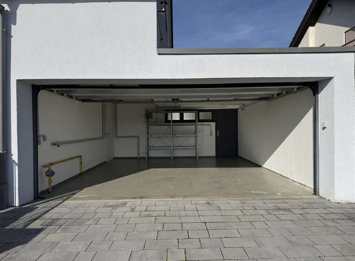 Die Doppelgarage mit Sektionaltor bietet Platz für zwei Fahrzeuge und verfügt über einen vorbereiteten Anschluss für eine E-Ladesäule. Von hier aus gelangen Sie direkt ins Haus oder auf die gepflasterte Terrasse hinter der Garage.