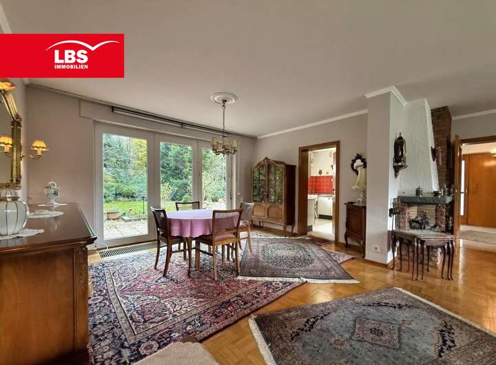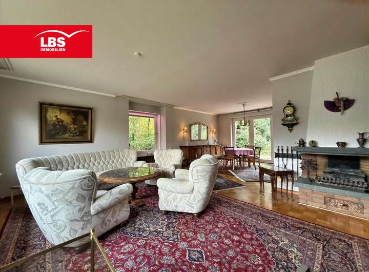 Geradeaus gelangt man durch den Eingangsbereich in das helle Wohnzimmer mit offenem Kamin, das ebenfalls mit dem Essbereich verbunden ist.