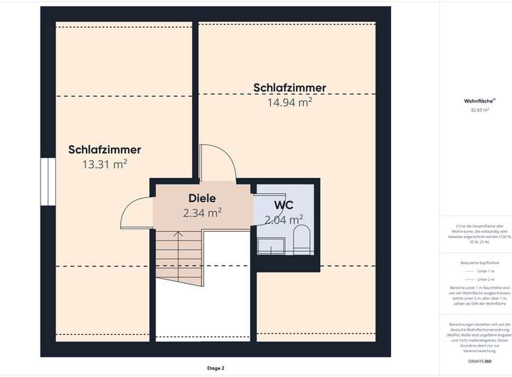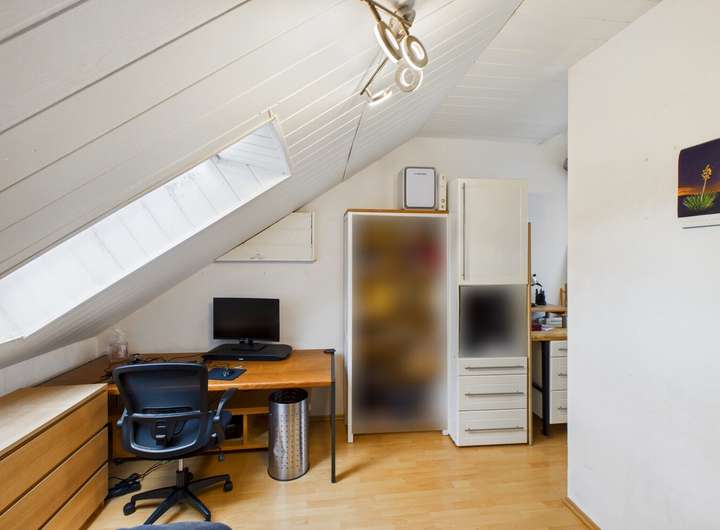 Im Dachgeschoss befinden sich zwei helle Räume und ein Gäste-WC ohne Fenster. Das linke Zimmer ist mit einem bodentiefen Fenster in südlicher Ausrichtung ausgestattet und erhält dadurch viel Licht. Das rechte Zimmer zeichnet sich durch seinen interessanten Grundriss aus und bietet verschiedene Nutzungsmöglichkeiten.