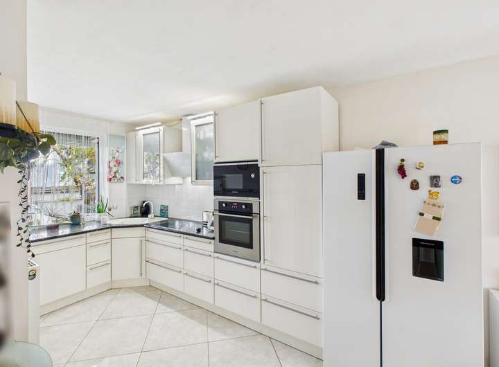 Der offene Wohn- und Essbereich mit angrenzender Küche bildet das Herzstück des Hauses und umfasst insgesamt ca. 38 m². Große Fensterflächen sorgen für Helligkeit und schaffen eine angenehme Verbindung zwischen Innen- und Außenbereich. Die Einbauküche von Nolte mit Granit-Arbeitsplatte fügt sich harmonisch in den Raum ein und kann nach individuellen Vorstellungen gestaltet werden.