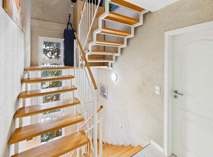 Im Eingangsbereich zeigt sich die gelungene Kombination aus Großzügigkeit und Helligkeit. Der Flur bietet ausreichend Platz und wird durch das große Fenster entlang der Treppe mit Tageslicht durchflutet. Hier befinden sich ein Abstellraum und ein Gäste-WC mit Fenster.