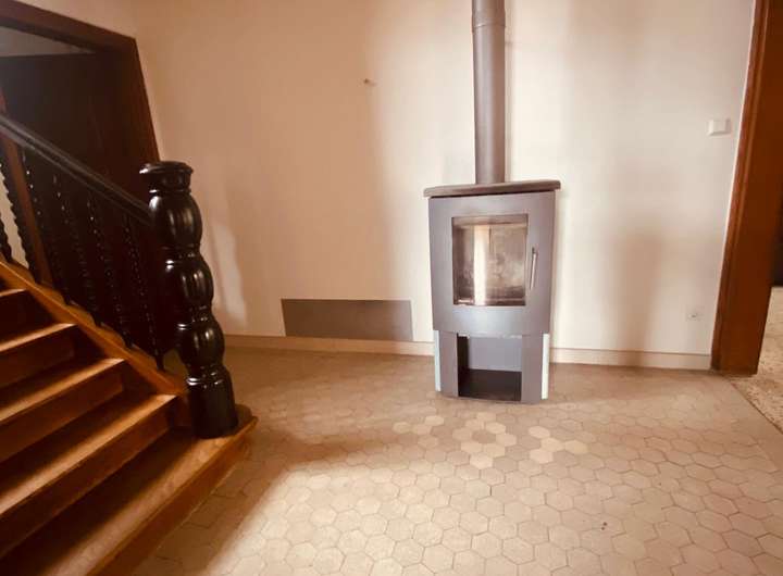 Im Erdgeschoss befinden sich ein großzügiger Eingangsbereich mit Kaminofen, zwei Zimmer, die als Ess- und Wohnraum genutzt werden können, eine moderne Einbauküche und ein Gäste-WC.