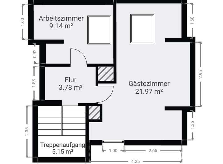 Zwei ausgebaute Zimmer, eines davon mit Gaube, das andere mit Dachflächenfenstern.