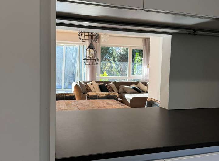 Eine Durchreiche zum Wohnzimmer hält den Kontakt zum Wohnbereich und Speisen und Getränke können direkt gereicht werden.