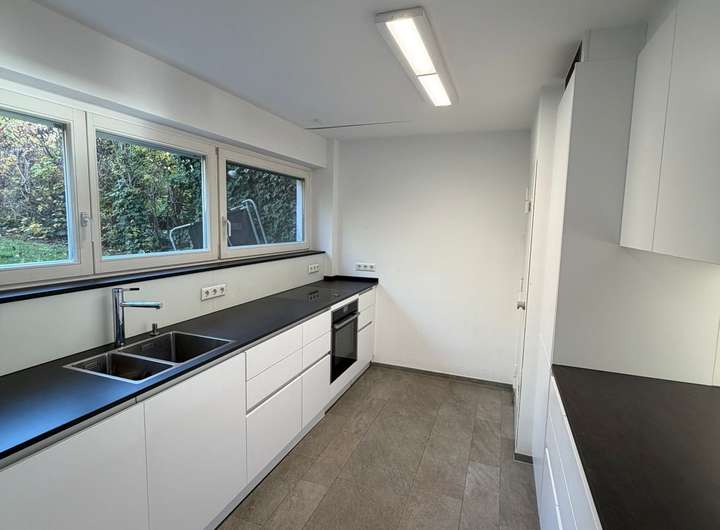 Die Küche ist mit einer hochwertigen Einbauküche ausgestattet und die lange Fensterfront mit direktem Blick in den Garten wirkt entspannend beim Kochen.