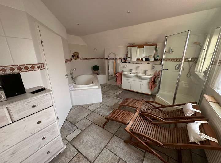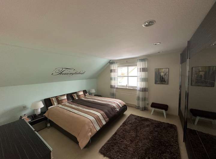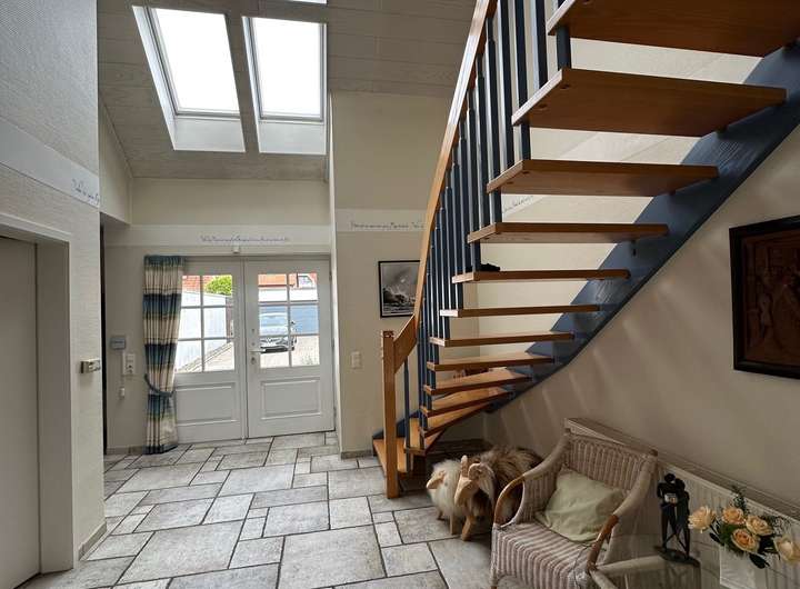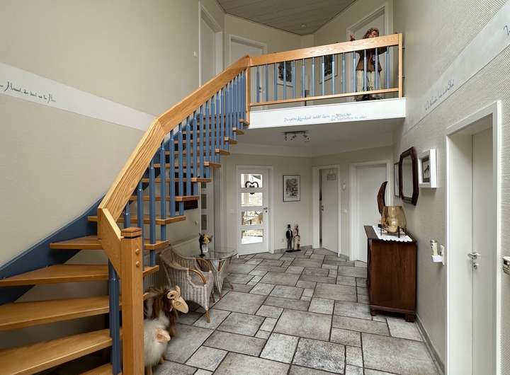 Dieses sehr gepflegte und charakteristische Einfamilienhaus mit ca. 196 m² Wohnfläche wurde 1996 erbaut und bietet 5 Zimmer auf zwei Etagen. Durch die Doppelgarage gelangt man trockenen Fußes direkt in den lichtdurchfluteten Eingangsbereich mit Galerie. Zusätzlich gibt es noch einen 3. Außenstellplatz von dem man ebenfalls direkt ins Haus gelangen kann. Die Fenster im EG und OG sind mit elektrischen Rolladen ausgestattet, teilweise mit hochwertigen Fliegenschutzgittern. Die beiden Bäder sind vollwertig mit Dusche ausgestattet, wobei das Badezimmer im OG als Wellnessraum mit genutzt werden kann. Hier gibt es zusätzlich eine Badewanne und eine Sauna inkl. Relaxliegen. Der liebevoll angelegte Garten ist sehr pflegeleicht und bietet mehrere Erholungsplätze inkl. eines kleinen geschlossenen Pavillons. Das Haus ist ab dem 01.07.2026 verfügbar. Eine Alarmanlage ist ebenfalls vorhanden.