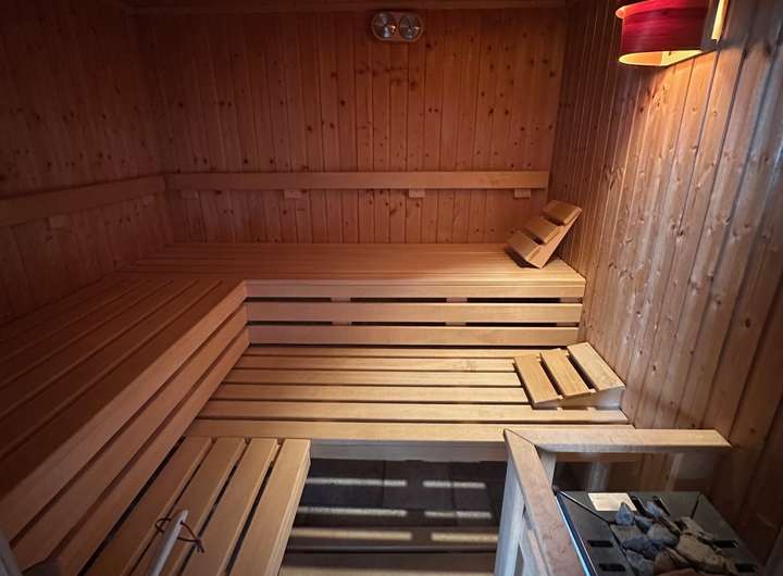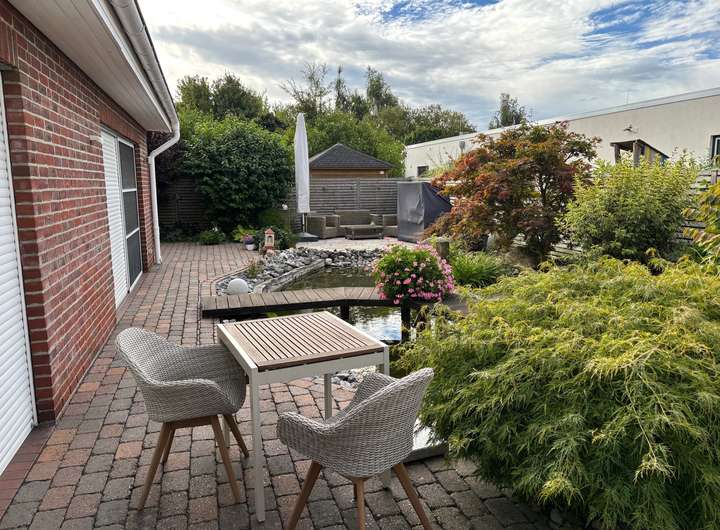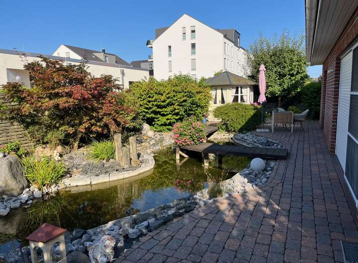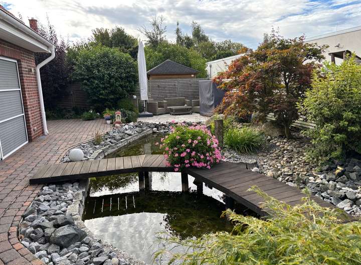 Natursteinfliesen, Kamin, Sauna, Fliegenschutzgitter, Alarmanlage, Gartenanlage mit Teich und Pavillon, Glasfaser-Anschluss