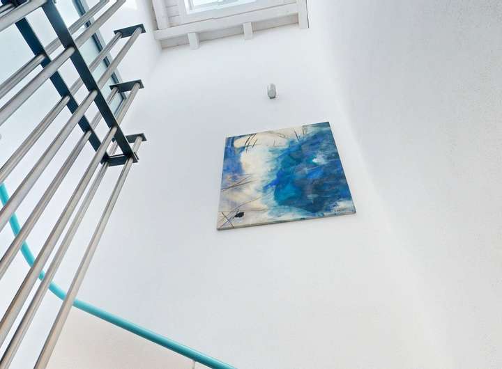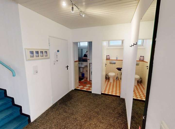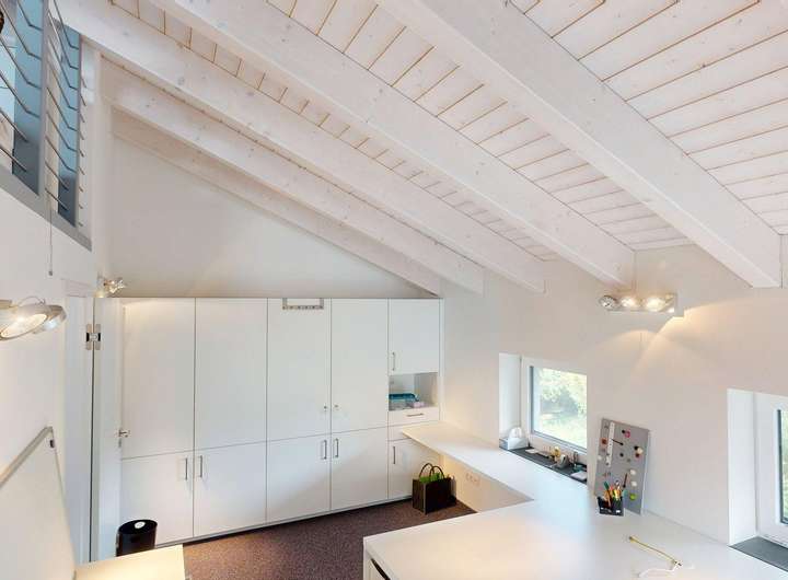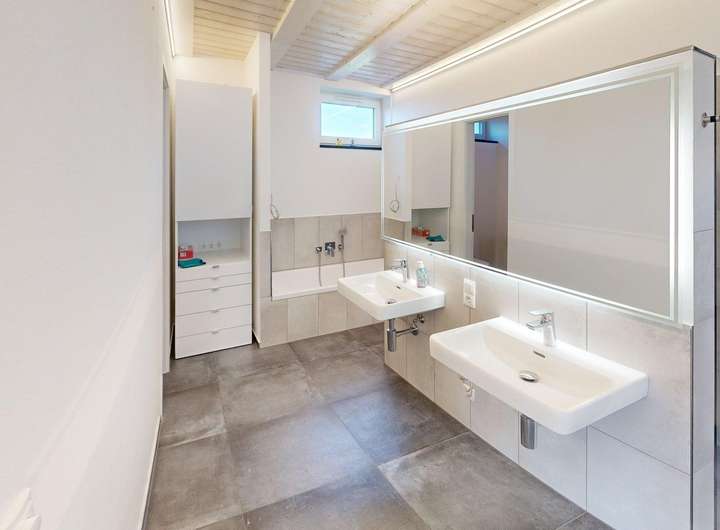 Für ein angenehmes Raumklima wurde ein Lehmputz an ausgewählten Wandflächen verarbeitet. Er ist feuchtigkeitsregulierend, unterstützt die Wärmespeicherung und bindet Schadstoffe und Gerüche. Im Haus befinden sich ein Vollbad, drei Duschbäder und ein Gäste-WC. Das Duschbad im Erdgeschoss ist barrierefrei und behindertengerecht.