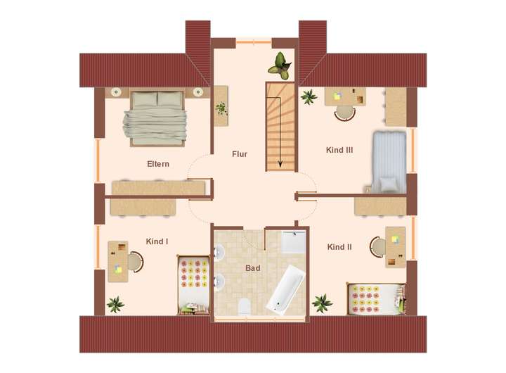 Hier gibt es ein Elternschlafzimmer und drei Kinderzimmer, sowie ein großzügiges Bad.