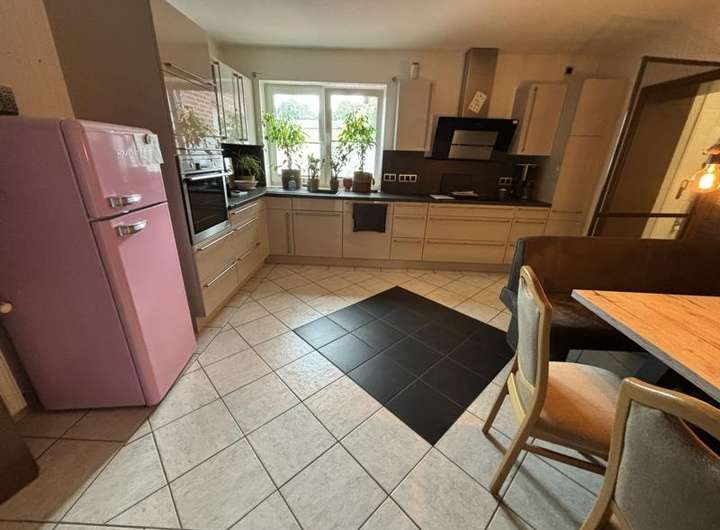 Platz hat man nicht nur im Wohn- Essbereich, auch die Küche ist geräumig und mit der hellen Einbauküche ein echter Blickfang.