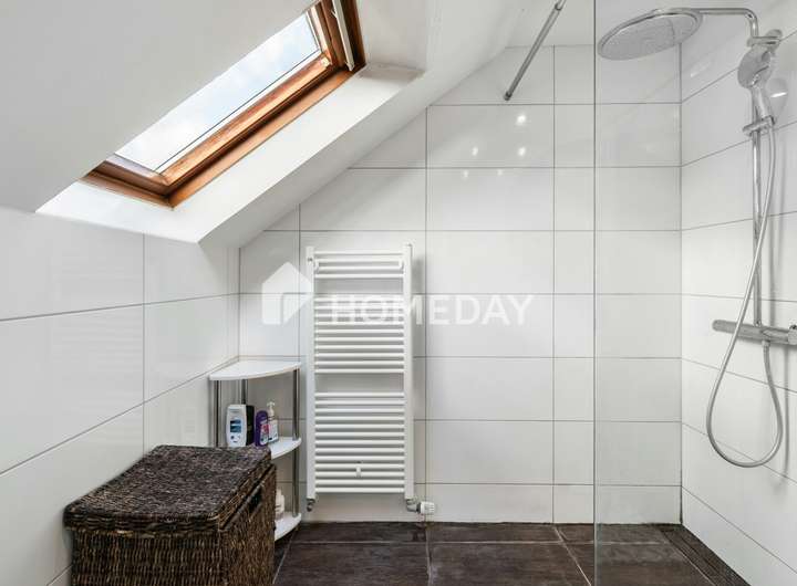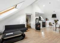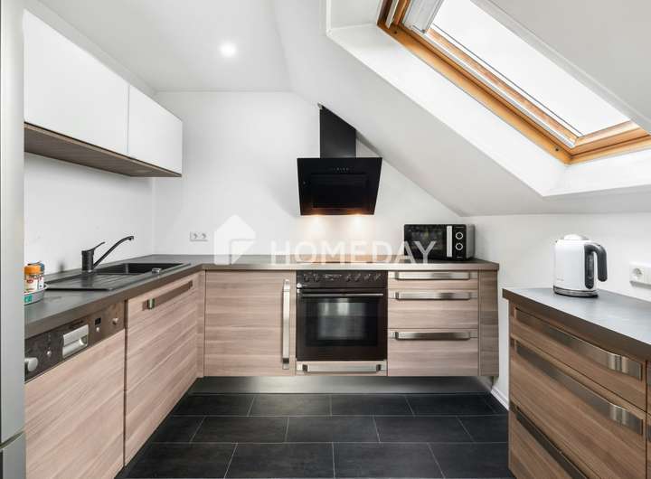 Der offene Wohn- und Essbereich überzeugt mit heller Architektur und klaren Linien. Große Dachfenster fluten den Raum mit Tageslicht, der Kamin schafft ein Gefühl von Wärme und Geborgenheit. Die angrenzende Loggia und die großzügige Dachterrasse lassen Sie Sonne und Weite genießen – perfekt für alle, die Wert auf Privatsphäre und Freiheit legen. Die Küche ist geschickt in den Raum integriert und fügt sich harmonisch in das moderne Wohnkonzept ein.