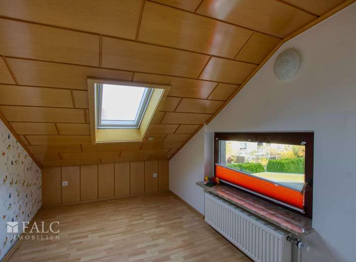 Über eine stilvolle Ahornholz-Treppe erreichen Sie das Obergeschoss. Vom Treppenflur aus verteilen sich drei Zimmer sowie ein hell gefliestes Duschbad mit Tageslicht. Ein weiteres Highlight ist der ausgebaute Dachboden, zugänglich über eine Raumspartreppe in einem der Zimmer – ideal als Kinder- oder Jugendzimmer, Homeoffice oder Hobbyraum.