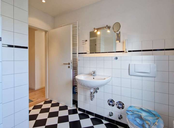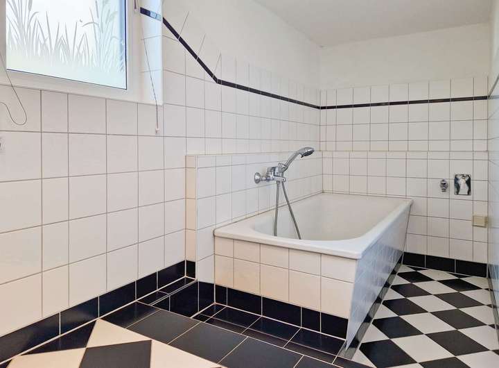 Das Tageslichtbad verfügt über Dusche und Badewanne – perfekt für gemütliche Stunden. Die Badewanne im Badezimmer ist über zwei Stufen erreichbar.