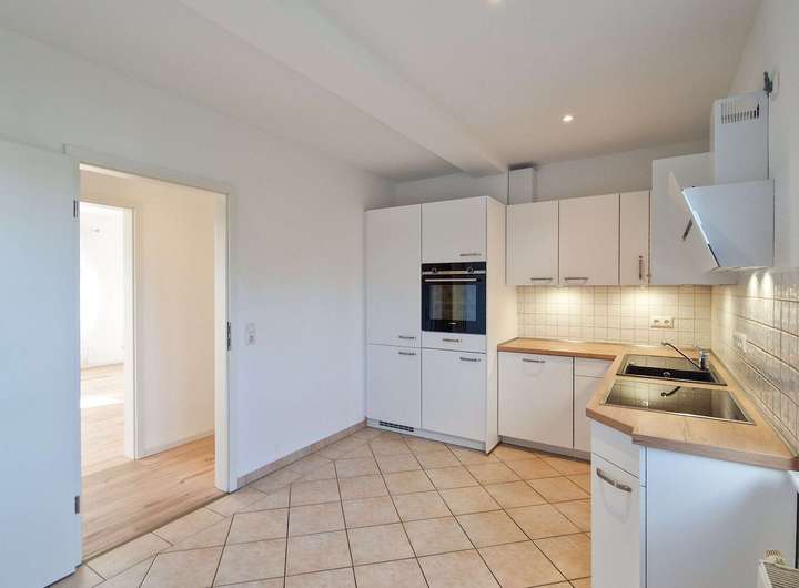 Die im Jahr 2021 neu installierte Küche der Marke "Nobilia" überzeugt mit hochwertigen Einbaugeräten und einer Waschmaschine. Ein idealer Ort für gemeinsame Mahlzeiten.