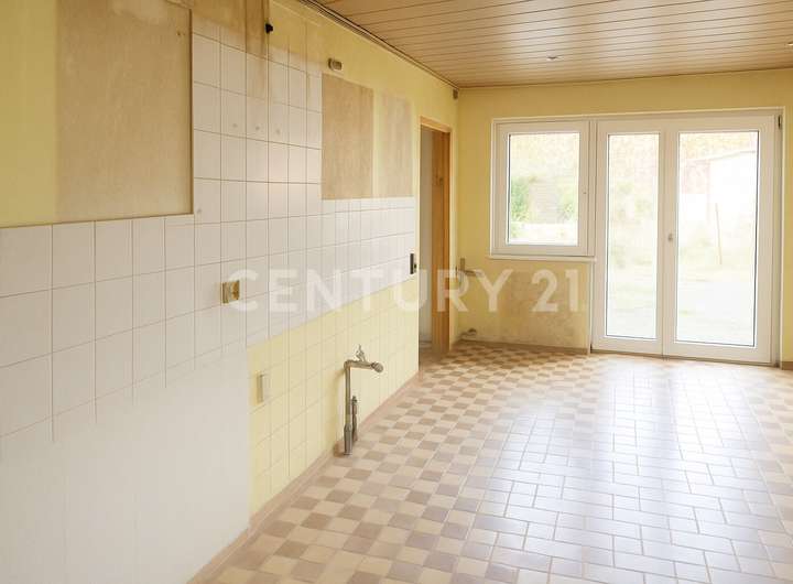 Von hier aus erreicht man die Küche. Diese ist funktional gestaltet und bietet ausreichend Platz für eine Küchenzeile sowie einen kleinen Essbereich. Zusätzlich hat sie einen direkten Zugang zum Garten, was besonders praktisch für Hobbyköche oder Familien ist. Das Badezimmer befindet sich ebenfalls im Erdgeschoss und ist zweckmäßig ausgestattet.