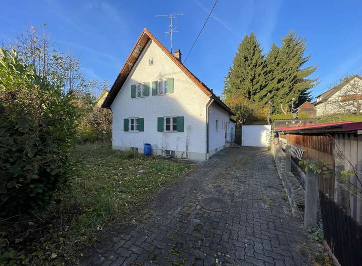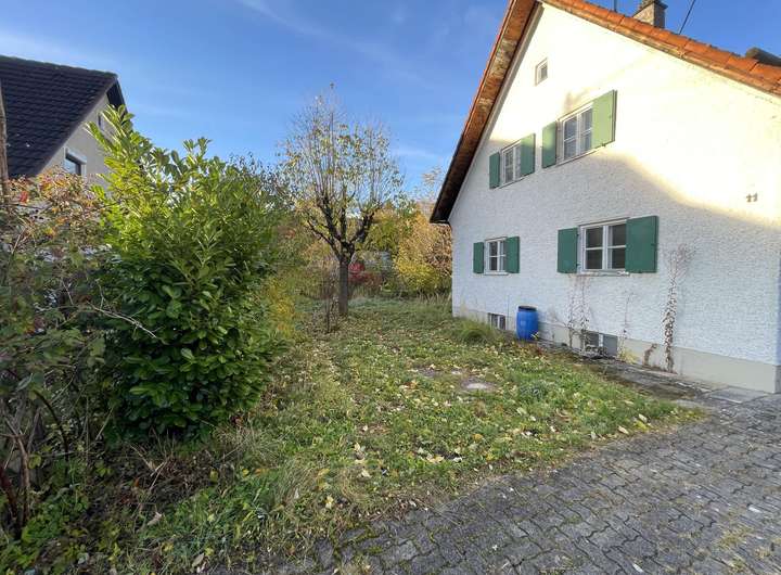 Aktuell befindet sich auf dem Grundstück noch ein älteres Einfamilienhaus mit Anbau und eine Einzelgarage aus Metall.