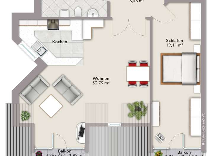 Große bodentiefe Fenster im Wohn- und Schlafzimmer lassen viel Tageslicht herein und schaffen eine offene, einladende Wohnstimmung. Vom Wohnbereich und Schlafzimmer gelangen Sie jeweils auf den sonnigen Süd-West-Balkon – der perfekte Ort, um den Tag in der Abendsonne ausklingen zu lassen.