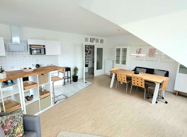 Der Wohnbereich mit seiner offenen Einbauküche bildet das Herzstück der Wohnung. Hier lässt sich Kochen, Essen und Entspannen wunderbar miteinander verbinden.