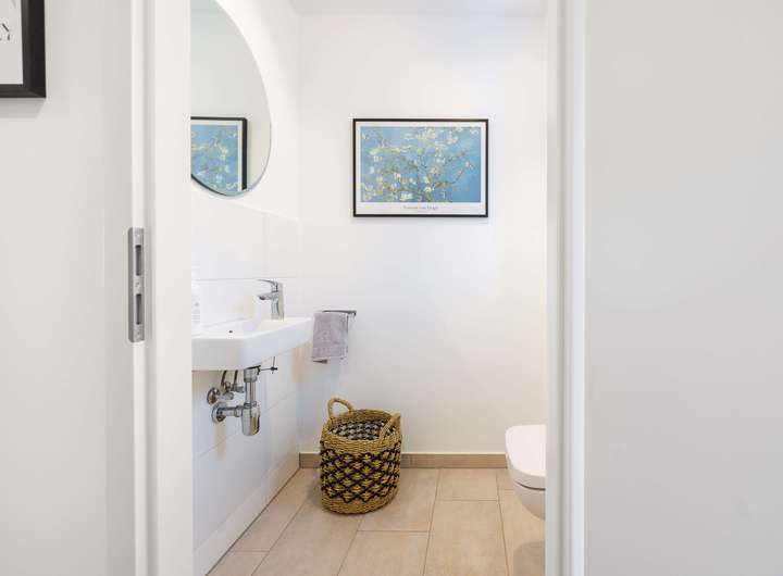 Bereits im Eingangsbereich zeigt sich die durchdachte Planung: Die geschlossene Diele bietet eine praktische Garderobennische mit Platz für Jacken, Schuhe und Taschen – aufgeräumt und unauffällig integriert. Ergänzt wird das Erdgeschoss durch ein separates Gäste-WC sowie einen Abstellraum unter der Treppe, der als Stauraum für Alltagsgegenstände dient.