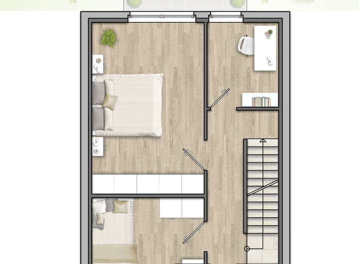 Im Obergeschoss befinden sich zwei gut geschnittene Schlafzimmer sowie ein separates Arbeitszimmer – ideal für Homeoffice, Gäste oder Kinder. Das moderne Tageslichtbad ist ausgestattet mit einer bodengleichen Dusche, einer Badewanne, einem Handtuchheizkörper und den Anschlüssen für Waschmaschine und Trockner.