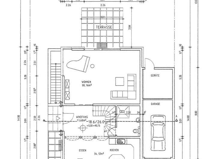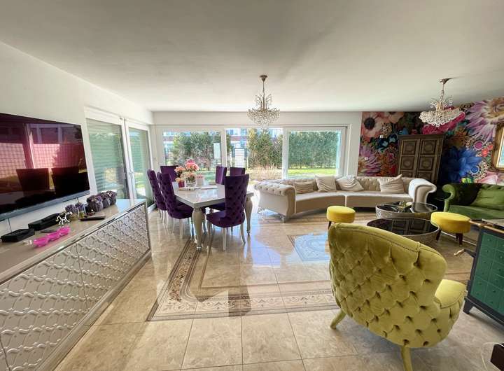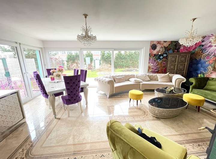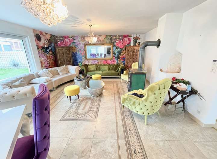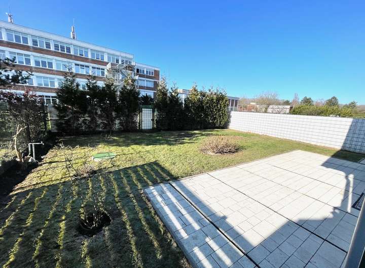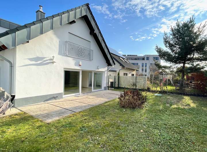 Vom Wohnbereich aus betreten Sie die großzügige Terrasse und den Garten.