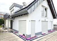 Eine Garage mit einem Pkw-Stellplatz davor gehört zum Haus.