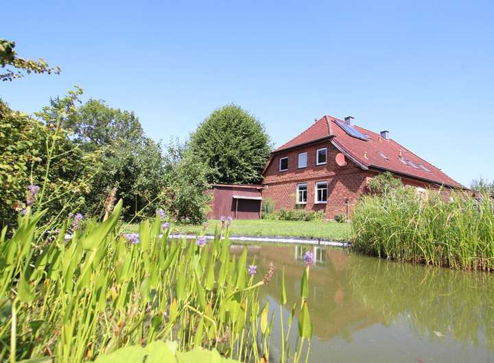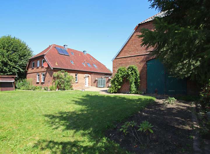 Der liebevoll gestaltete Garten lädt zum Entspannen und Verweilen ein. Die große Terrasse ist ideal für Sommerabende im Freien, während der Teich eine besondere Atmosphäre schafft. Das Grundstück ist teilweise umzäunt und bietet ausreichend Platz für Kinder und Freizeitaktivitäten. Für Fahrzeuge stehen ein Carport für zwei Autos sowie drei weitere Stellplätze zur Verfügung. Zudem gibt es eine Scheune mit knapp 100 m², die vielfältige Nutzungsmöglichkeiten bietet.